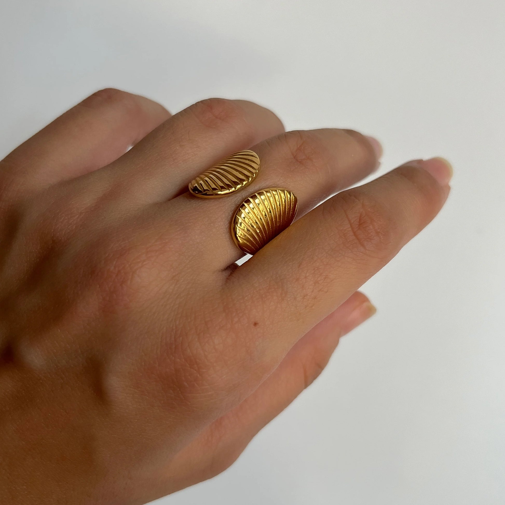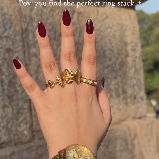 Inspired by the beauty of the sea, the Shell Ring is a statement piece designed to bring effortless elegance to your jewellery collection. Featuring intricately detailed shell motifs in a polished gold-tone finish, this open cuff bracelet exudes luxury and coastal charm. Lightweight yet bold, it's perfect for stacking or wearing solo for a chic, beach-inspired look.